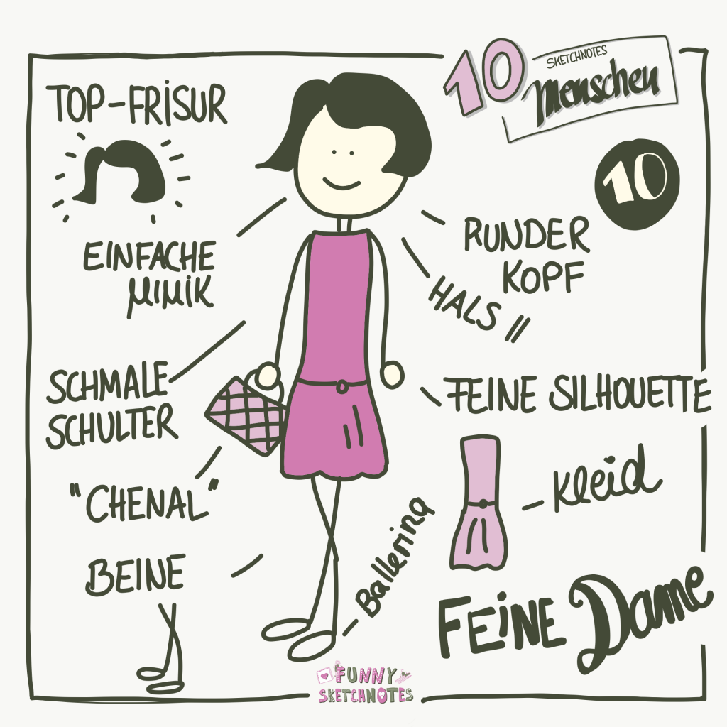 Jaaaaaa – Sketchnotes haben nichts mit dem Alter zu tun oder? Ich denke von jung bis alt – immer spannend! Hihi heute habe ich dir die feine alte Dame mitgebracht. Und du siehst – es sind nur die Haare, die da das Alter anzeigen. Bzw. Nur die Frisur. Farbe ausgetauscht und gleich 20 JAhre jünger oder? Der Körper ist dieses Mal quasi ein Dreieck, lediglich die Spitze ist am Kopf ausgespart. Wie sieht es wohl aus, wenn der Körper komplett auf dem Dreieck sitzt? Einfach immer wieder ausprobieren – jede Form birgt noch unendliche Möglichkeiten! Mein Lieblingsdetail sind die Highheels – ganz ganz easy… Der Absatz ist immer nur die Verlängerung der beine und der Schuh / Fuß einfach nur ein Oval. Mit einem einfachen Strich wird dann der geschlossene Schuh zum Pump!